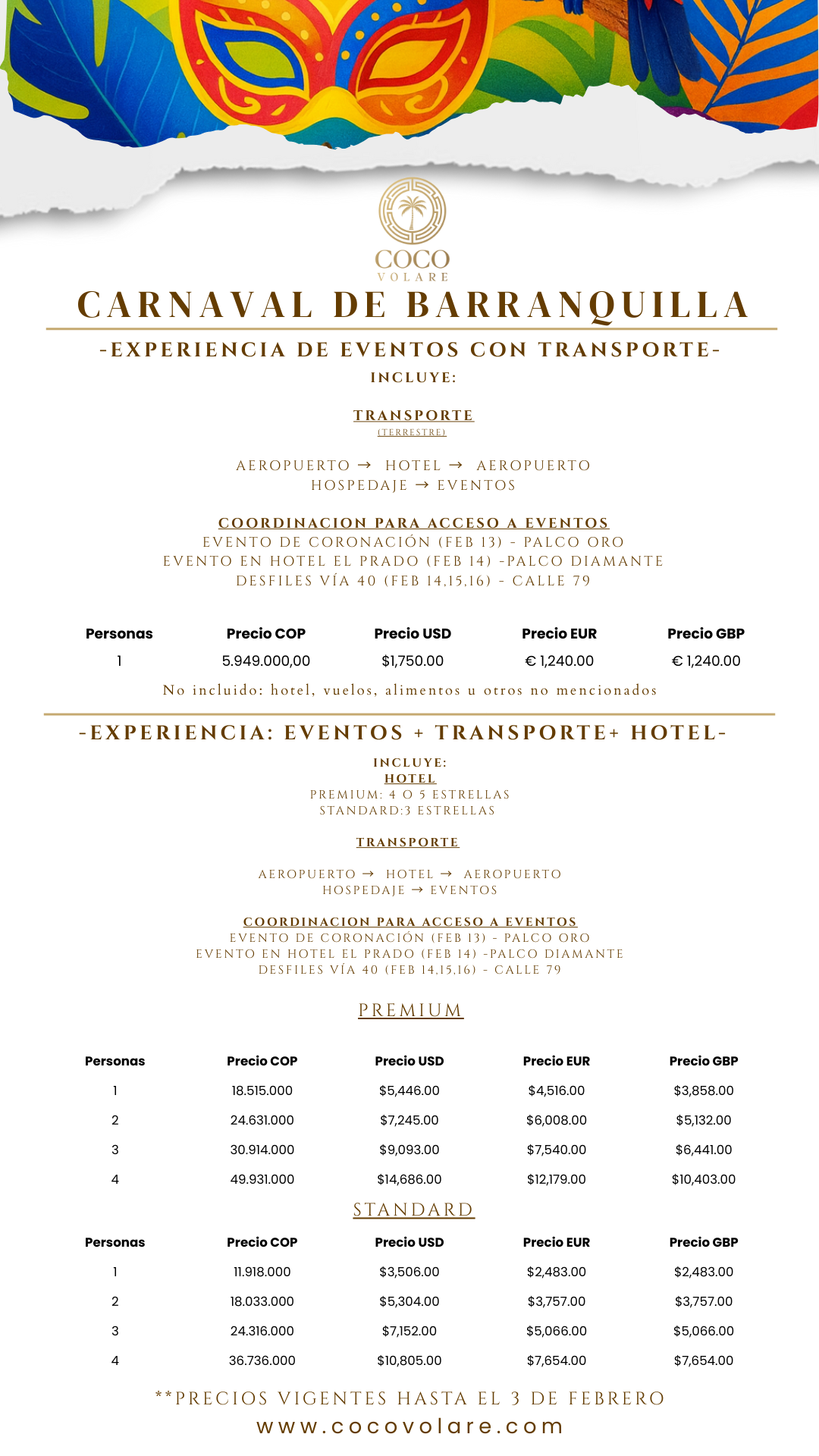 Schedules, venues, and access options depend on the official Carnival organizers and may be subject to minor adjustments. Coco Volare accompanies travelers to ensure organization and comfort.